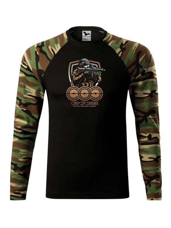 Lekka i wygodna bluza typu longslive z długim rękawem o dopasowanym kroju. Unisex. Okrągły dekolt. Zapewnia swobodę ruchu podczas wszelkich aktywności fizycznych. Idealnie sprawdzi się podczas zajęć na strzelnicy czy aktywności na świeżym powietrzu. Przód i tył bluzy – czarny, rękawy kamuflaż browncamo. Na piersi logo Out Of Office. Bluza wykonana jest ze 100% bawełny.