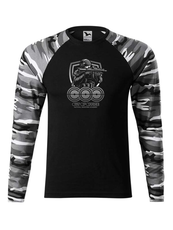 Lekka i wygodna bluza typu longslive z długim rękawem o dopasowanym kroju. Unisex. Okrągły dekolt. Zapewnia swobodę ruchu podczas wszelkich aktywności fizycznych. Idealnie sprawdzi się podczas zajęć na strzelnicy czy aktywności na świeżym powietrzu. Przód i tył bluzy – czarny, rękawy kamuflaż graycamo. Na piersi logo Out Of Office. Bluza wykonana jest ze 100% bawełny.
