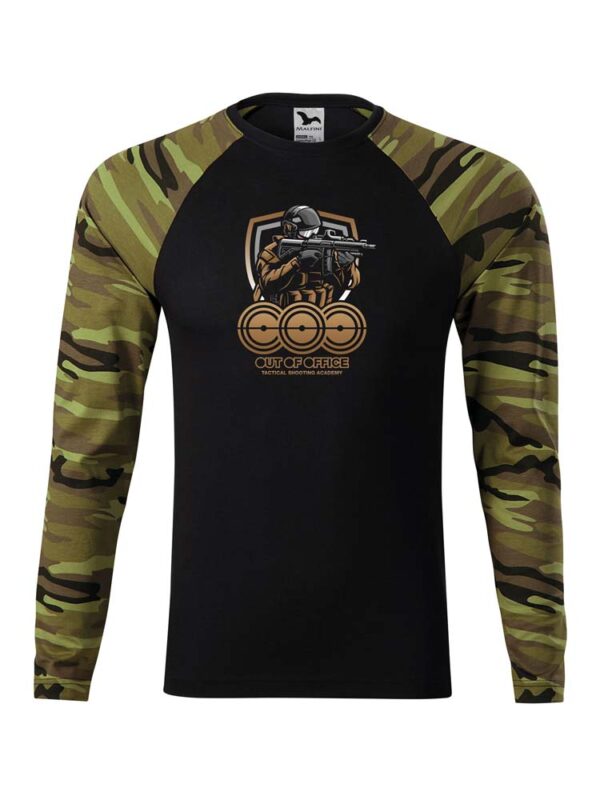 Lekka i wygodna bluza typu longslive z długim rękawem o dopasowanym kroju. Unisex. Okrągły dekolt. Zapewnia swobodę ruchu podczas wszelkich aktywności fizycznych. Idealnie sprawdzi się podczas zajęć na strzelnicy czy aktywności na świeżym powietrzu. Przód i tył bluzy – czarny, rękawy kamuflaż greencamo. Na piersi logo Out Of Office. Bluza wykonana jest ze 100% bawełny.