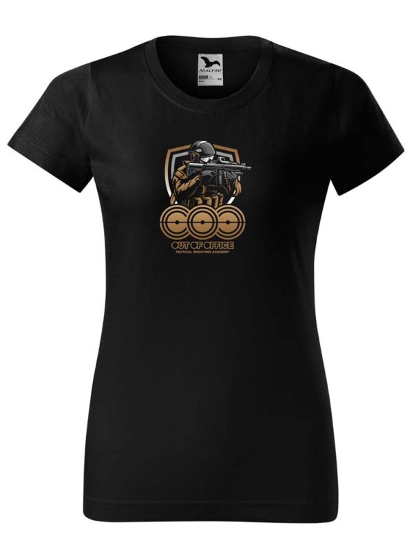 Klasyczny bawełniany czarny damski T-shirt z wcięciem w talii. Okrągły dekolt. Z przodu logo Out of Office. T-shirt wykonany jest ze 100% bawełny.